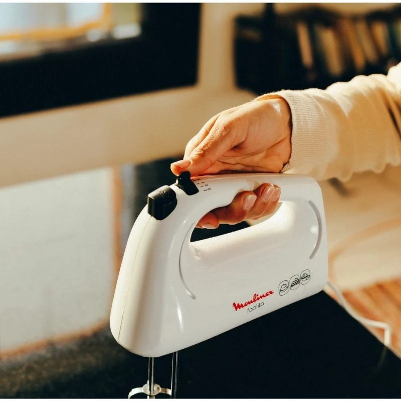 La batidora de mano Moulinex SX1502AR posee un diseño compacto con un cómodo agarre e incluye dos batidores metálicos que pueden extraerse mediante un botón eyector para facilitar su limpieza.