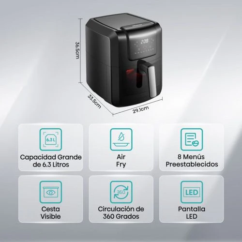La freidora de aire utiliza circulación de aire a 360°. El aire caliente circula de arriba abajo y vuelve a subir para crear una distribución de calor perfecta y uniforme. Esto permite obtener una costra crujiente y mantener el interior jugoso.