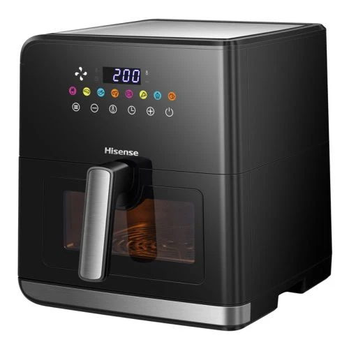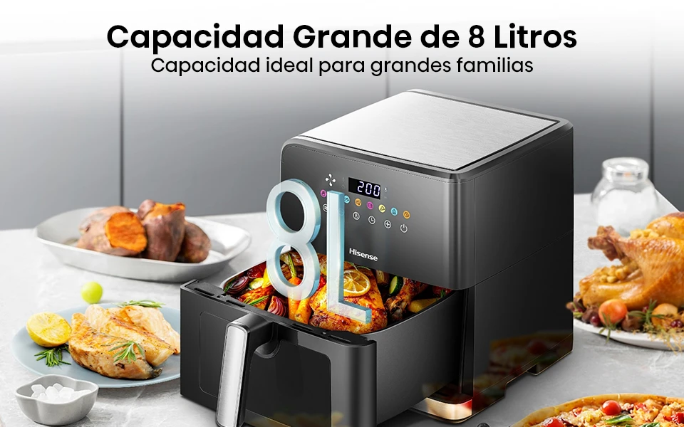 La freidora de 8L te facilitara la preparacion de las comidas para toda la familia. Con un diseño cuadrado de la cesta permitiendo maximizar el area de coccion y asi servir aun mas comida! Freír de manera más saludable con poco aceite La freidora de aire Hisense utiliza aire caliente para cocinar tus alimentos favoritos con hasta un 90% menos de aceite y grasa que la fritura tradicional, pero aún así logra un acabado crujiente dorado perfecto y un interior tierno. Ayudante de cocina versátil 8 programas preestablecidos te ayudarán a obtener la mejor opción de sabor. Los ajustes manuales de tiempo y temperatura permiten que tu creatividad se despliegue libremente en la cocina. Observa tu comida mientras cocina Con una ventana de gran tamaño transparente y una luz interna perfectamente ubicada, no es necesario abrir la cesta; ¡el proceso de cocción es claro con solo un vistazo! Distribución uniforme del calor La freidora de aire utiliza circulación de aire a 360°. El aire caliente circula de arriba abajo y vuelve a subir para crear una distribución de calor perfecta y uniforme. Esto permite obtener una costra crujiente y mantener el interior jugoso. Pantalla táctil fácil de usar La freidora de aire cuenta con un elegante y colorido display de control táctil sensorial. Puedes ajustar fácilmente el tiempo y la temperatura. Las delicias están disponibles con solo tocar un botón. Especificaciones Técnicas 310*379*341mm 8L 1700W 8 programasCapacidad ideal para grandes familias -8L