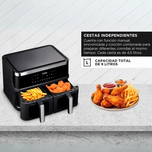 - Capacidad total: 9 litros, con doble canasta de 4.5 litros cada una.