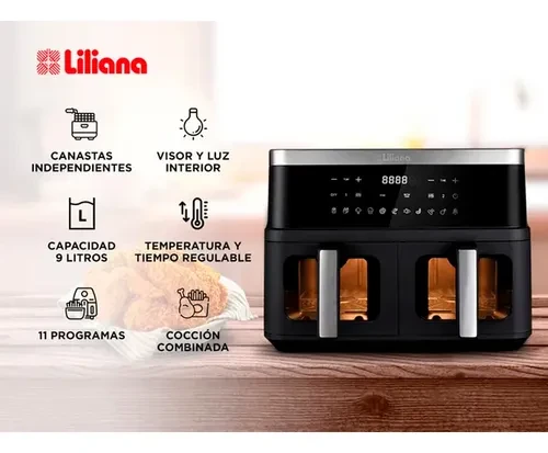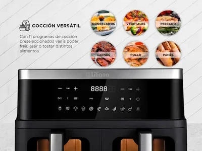 Freidora de Aire DualFryer de Liliana, la solución perfecta para una cocción inteligente, saludable y multifuncional en tu hogar! Con su diseño innovador de doble canasta y panel digital con 11 programas predeterminados, este equipo te permite cocinar dos alimentos al mismo tiempo de manera independiente o combinada. Además, su capacidad de 9 litros, su visor y luz interior, y su decoración en acero inoxidable hacen que cocinar sea más fácil, práctico y elegante. ¡Prepará tus platos favoritos con la calidad y versatilidad de Liliana!