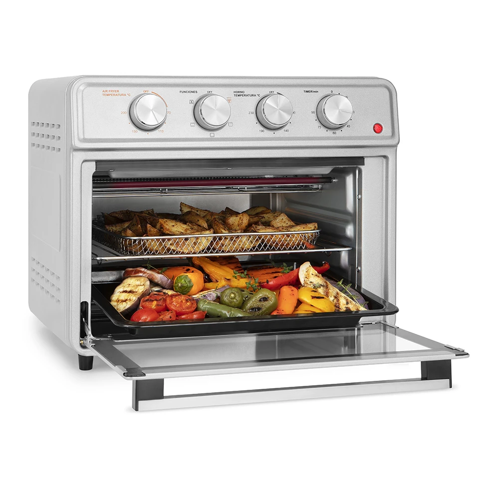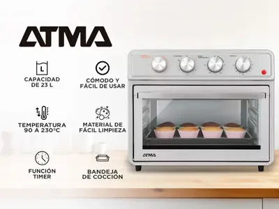 Con el Horno Grill Air Fryer de 23 litros de Atma descubrí una nueva forma de cocinar, con su función de timer incorporada, podrás cocinar tus platos favoritos de manera precisa y sin complicaciones. Con una capacidad generosa de 23L y una amplia gama de temperaturas, desde 90°C hasta 230°C, este horno te ofrece versatilidad para preparar una variedad de recetas.