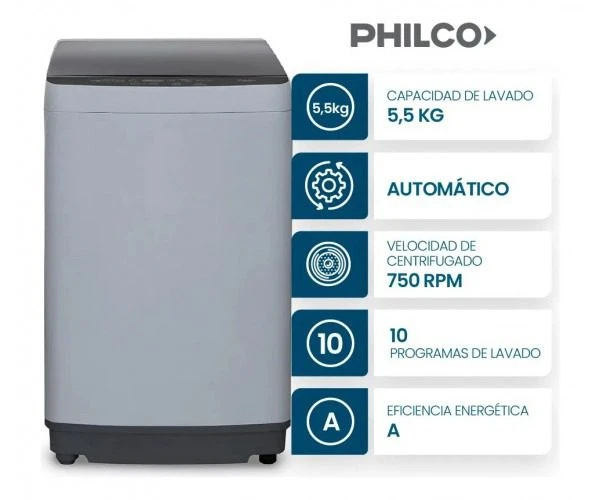 ¡Llevá la practicidad a tu hogar con elLavarropas Carga Superior 5,5Kg Philco Gris!