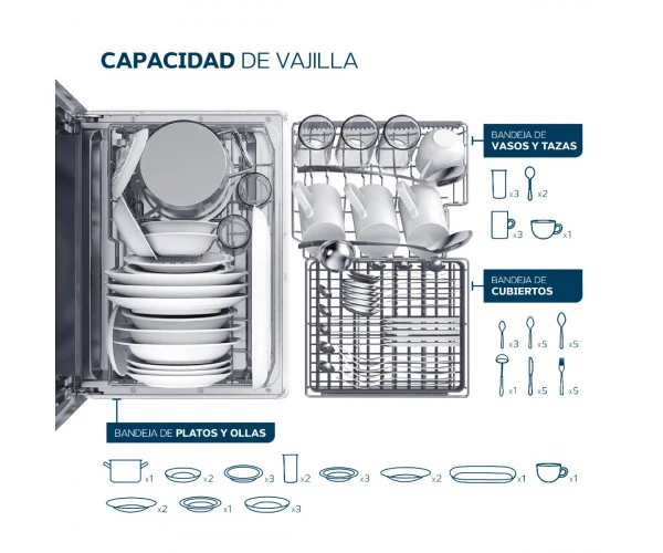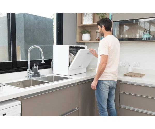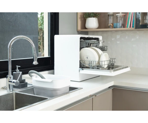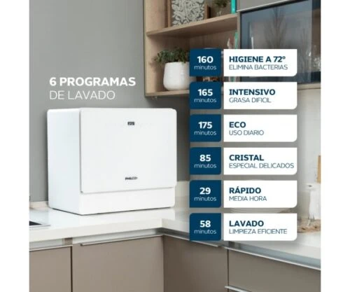 Su capacidad para 5 cubiertos y 2 cestos lo hace perfecto para el uso diario. Sin necesidad de instalación de agua, es práctico y fácil de usar. Sus 6 programas ECO, Intensivo, Hygiene 72°C, Copas, Lavado 58 minutos y Rápido garantizan limpieza impecable en cada ocasión.