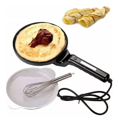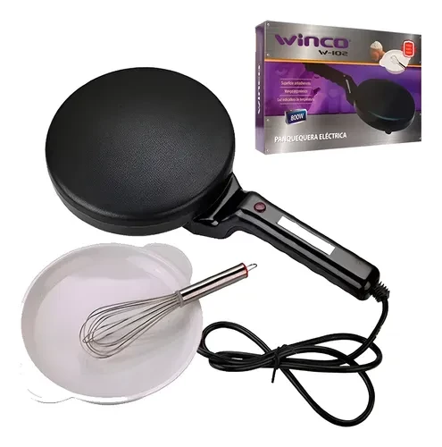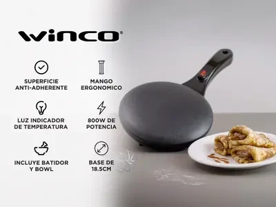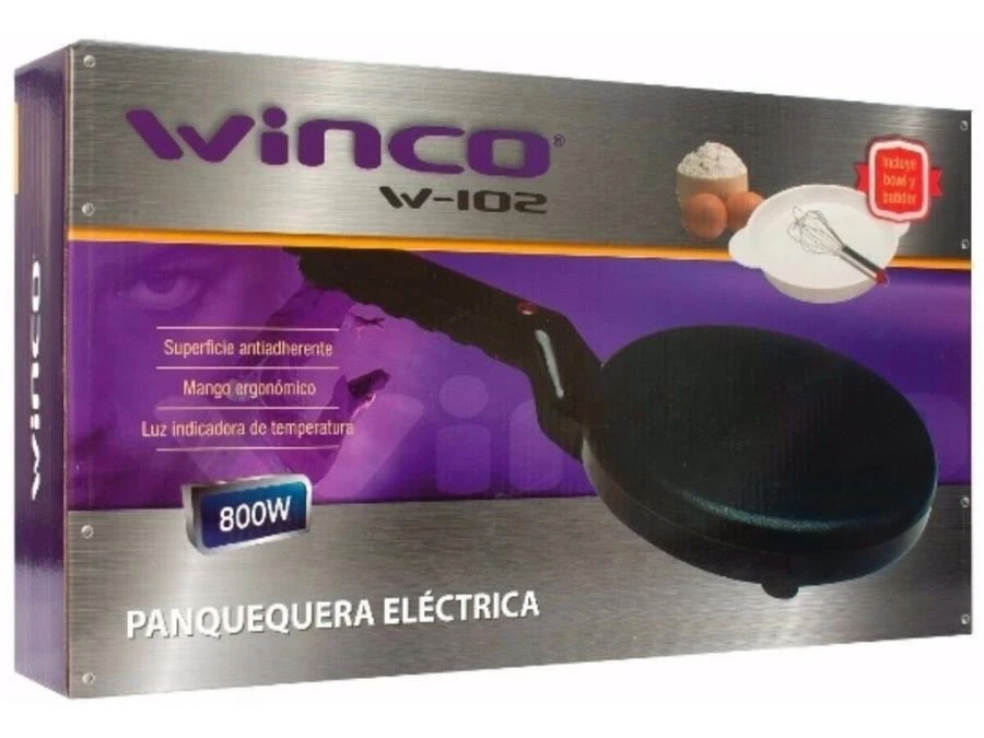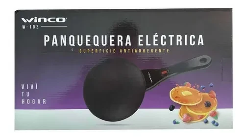 Caracteristicas Panquequera con superficie anti-adherente, mango ergonómico, luz indicador de temperatura, incluye batidor y bowl, potencia: 800W, base de 18.5 cm. de diámetro.