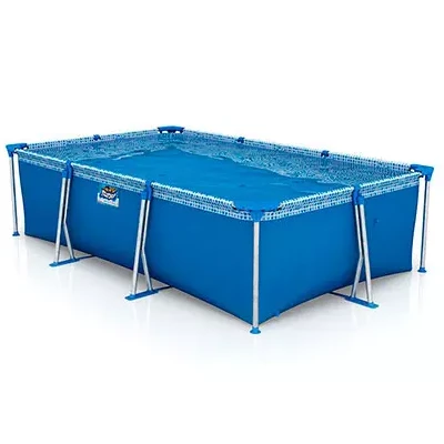 Piscina de lona, estructura metálica inoxidable y esquineros de PVC reforzados.