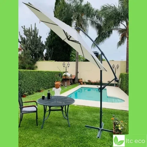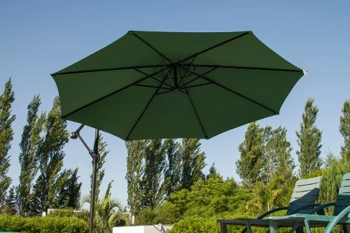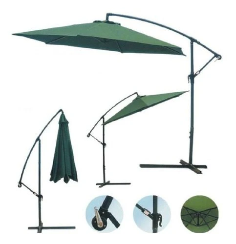 Sombrilla tipo colgante de 3m de diámetro con manivela para su cierre y apertura. Color verde disponible.