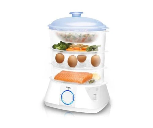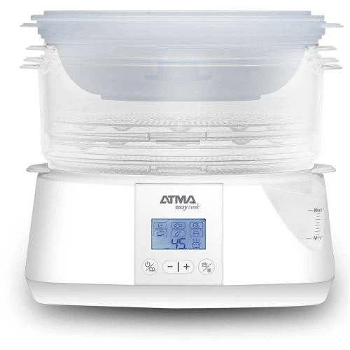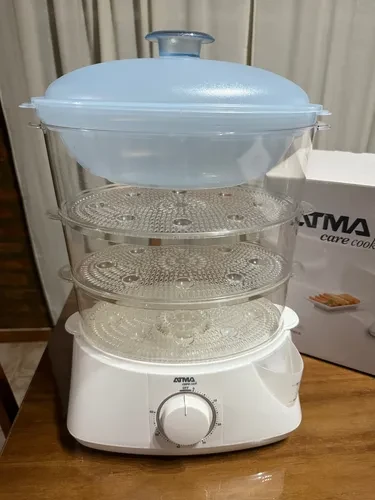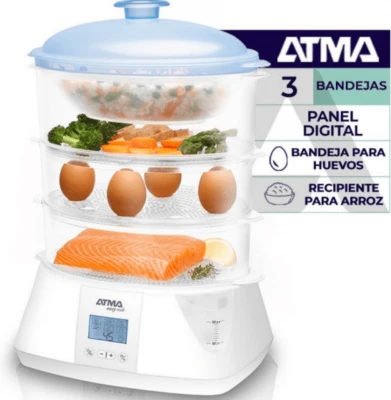 La Vaporiera 900W 1400 L Atma es Ideal Para Cocinar Todo Tipo De Comidas, Con 3 Bandejas Con Soporte Para Huevos, Un Timer De 60 Minutos Con Alarma. Contiene Apagado Automático Con Bandejas Apilables Para Ahorrar Espacio.