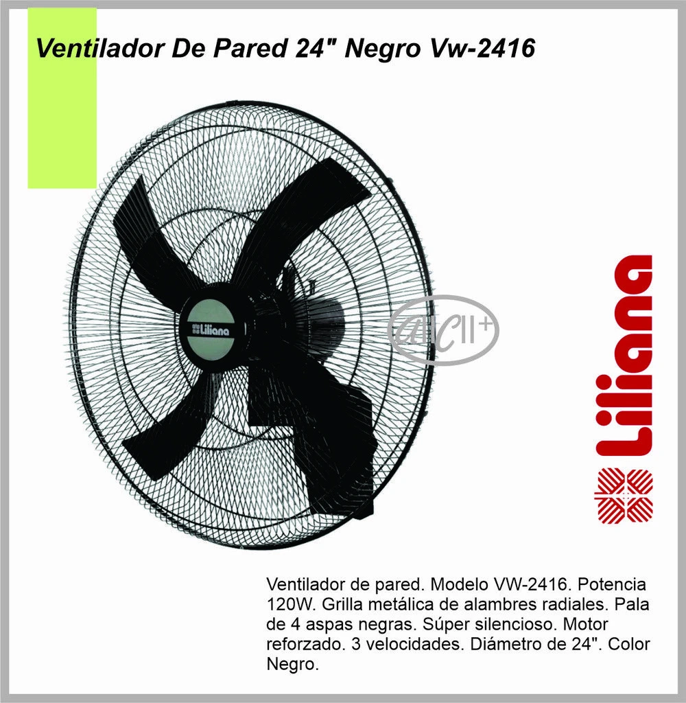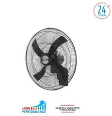 Ventilador de Pared High Performance Parrilla metálica. Cabezal oscilante y reclinable. 4 aspas negras. Súper silencioso. Potente motor. 3 velocidades. Diámetro de 24″. Potencia: 120 watts. Garantía 2 Años Industria Argentina.