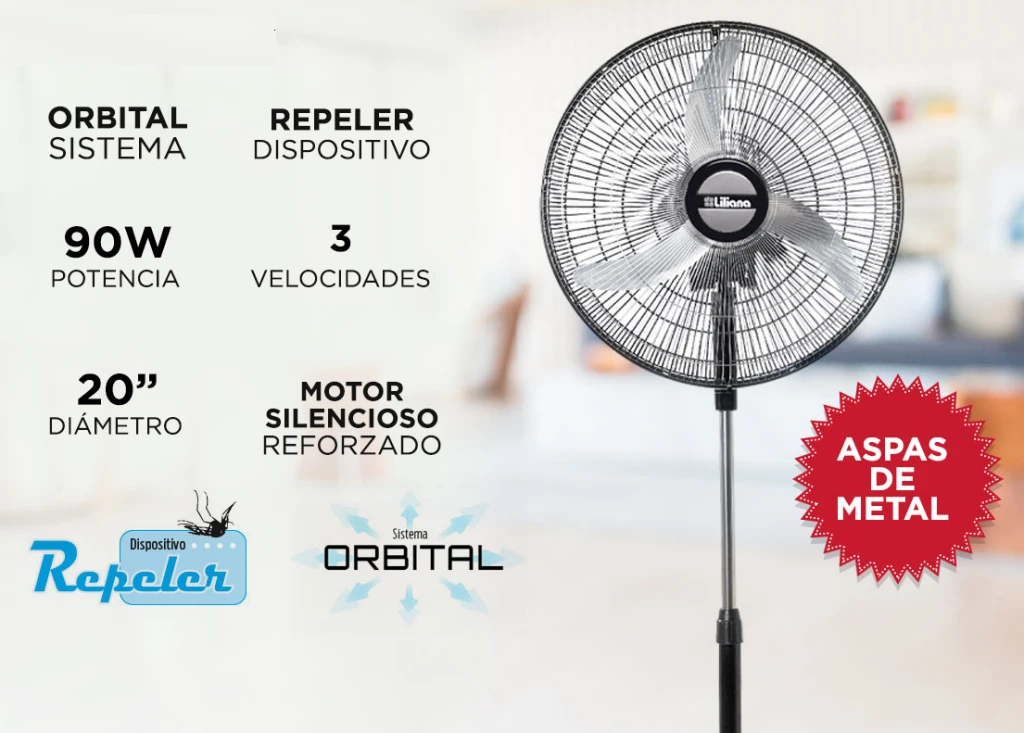 Parilla metálica. 3 aspas metálicas. Sistema Orbital. Dispositivo Repeler. Barral telescópico metálico de 1,70m. Base redonda. Súper silencioso. Potente motor. 3 velocidades. Diámetro de 20″. Potencia: 90 watts. Sistema Orbital Direcciona la brisa en forma horizontal y vertical. Este sistema permite que el cabezal del ventilador se desplace sobre su eje en forma elíptica, distribuyendo la brisa fresca en forma suave y uniforme hacia ambos lados como así también hacia arriba y hacia abajo. Esta acción posibilita la recirculación permanente del aire, permite bajar la temperatura del ambiente brindando una confortable sensación de frescura y bienestar. Dispositivo Repeler Permite colocar una tableta repelente de insectos de tamaño estándar. Las partículas liberadas por dichas tabletas son tomadas por las aspas del ventilador y distribuidas uniformemente en todo el ambiente.